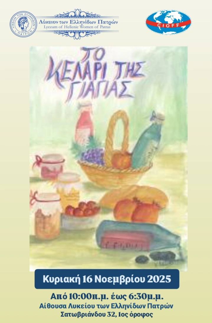 Την Κυριακή 16 Νοεμβρίου 2025, από τις 10.00πμ ως τις 6.30μμ, το Λύκειο των Ελληνίδων - Παράρτημα Πατρών διοργανώνει για 31η χρονιά την εκδήλωση-θεσμό «Το Κελάρι της Γιαγιάς».
