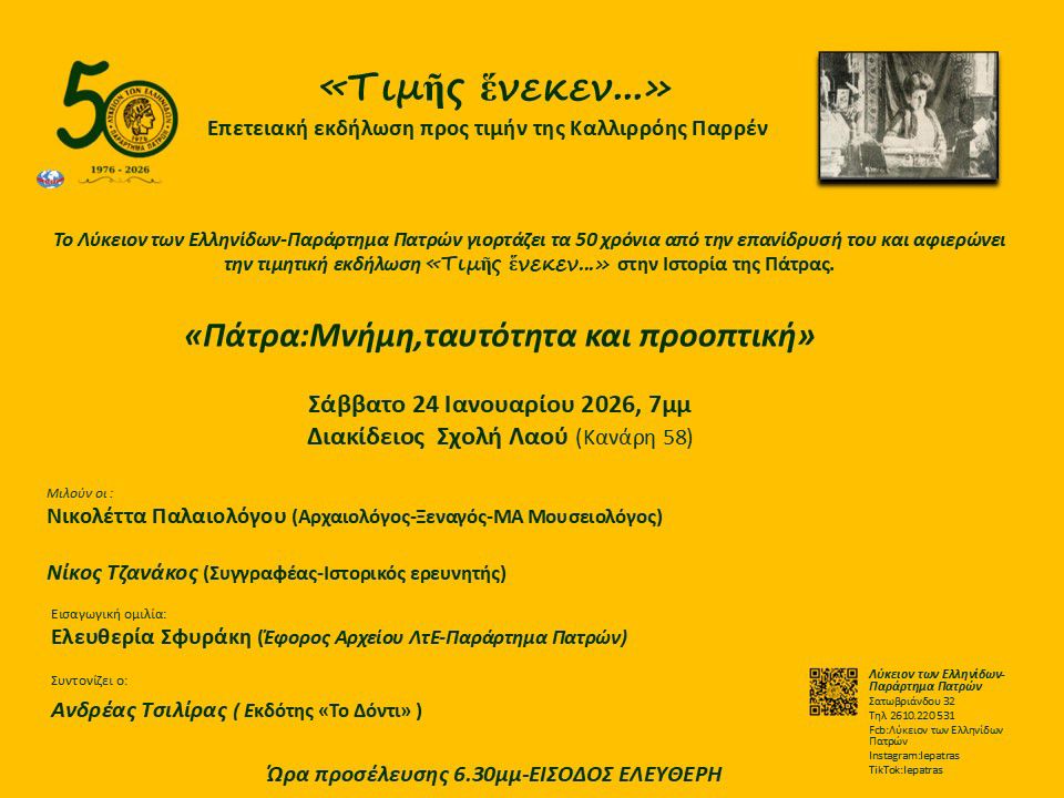 Το Λύκειον των Ελληνίδων-Παράρτημα Πατρών ξεκινάει να γιορτάζει τα 50 χρόνια της πολιτιστικής παρουσίας του αφιερώνοντας την επετειακή εκδήλωση «Τιμῆς ἕνεκεν...» στην Ιστορία της Πάτρας.